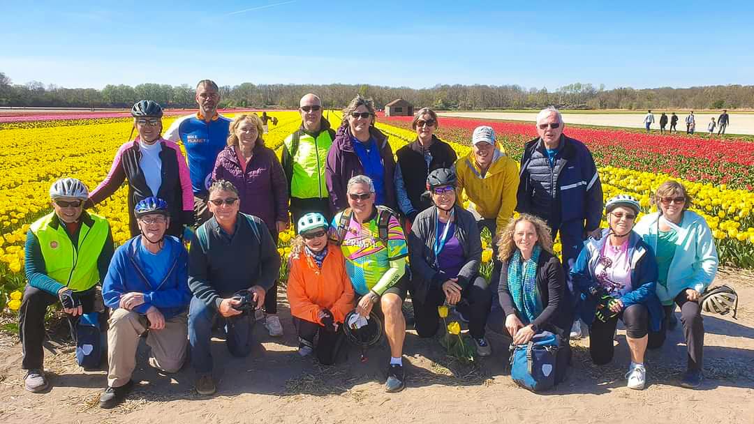 Senior cyclists with a local guide in the tulip gardens at Hortus Bulborum (photo credit: BikePlanet Tours)