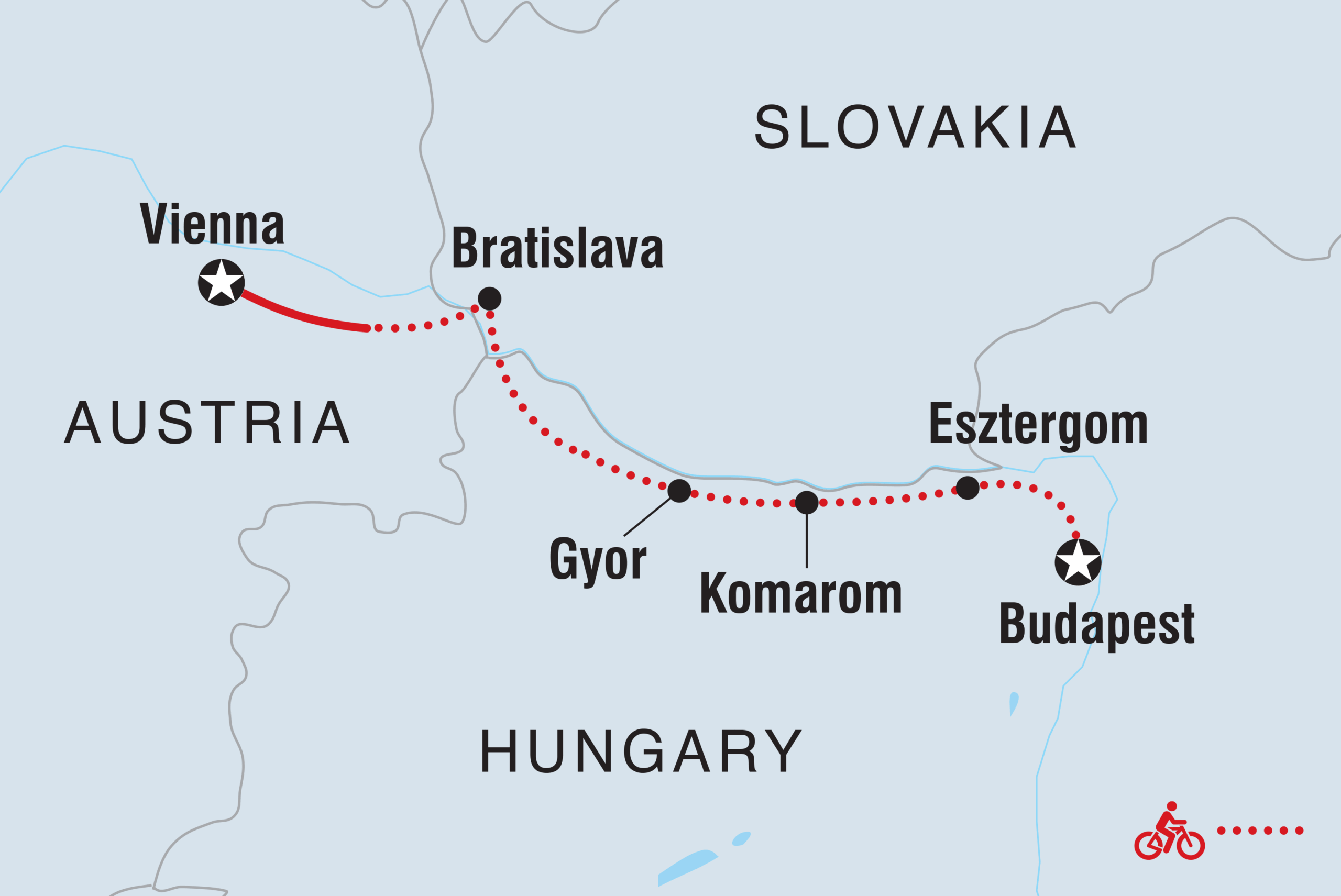 Intrepid offers an eight-day Vienna to Budapest Danube cycling route that covers approximately 357 kilometres and 910 metres of elevation gain over six days of cycling. This is our most popular Danube itinerary.