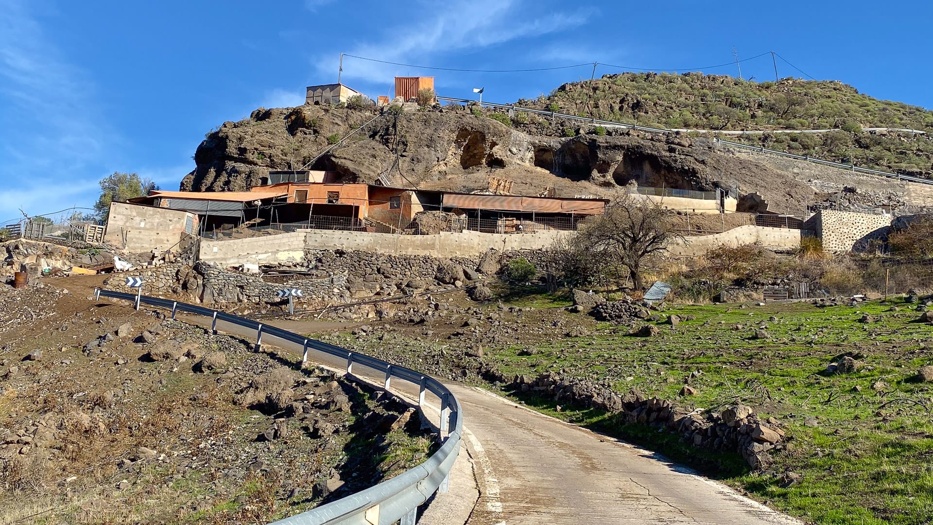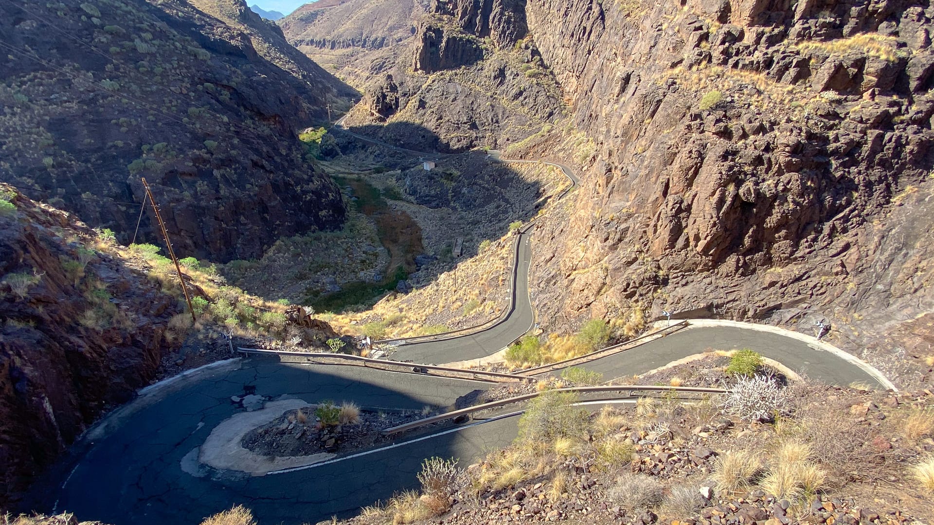 The GC210 runs along a canyon where the central drainage basin of the island opens up towards the valley of La Aldea and the sea. The three reservoirs you see are testament to how the waterway has been managed. La Presa de Caidero de la Niña reservoir has important historic value because it was the first time concrete was used in such constructions in the Canary Islands. It was finished in 1958.