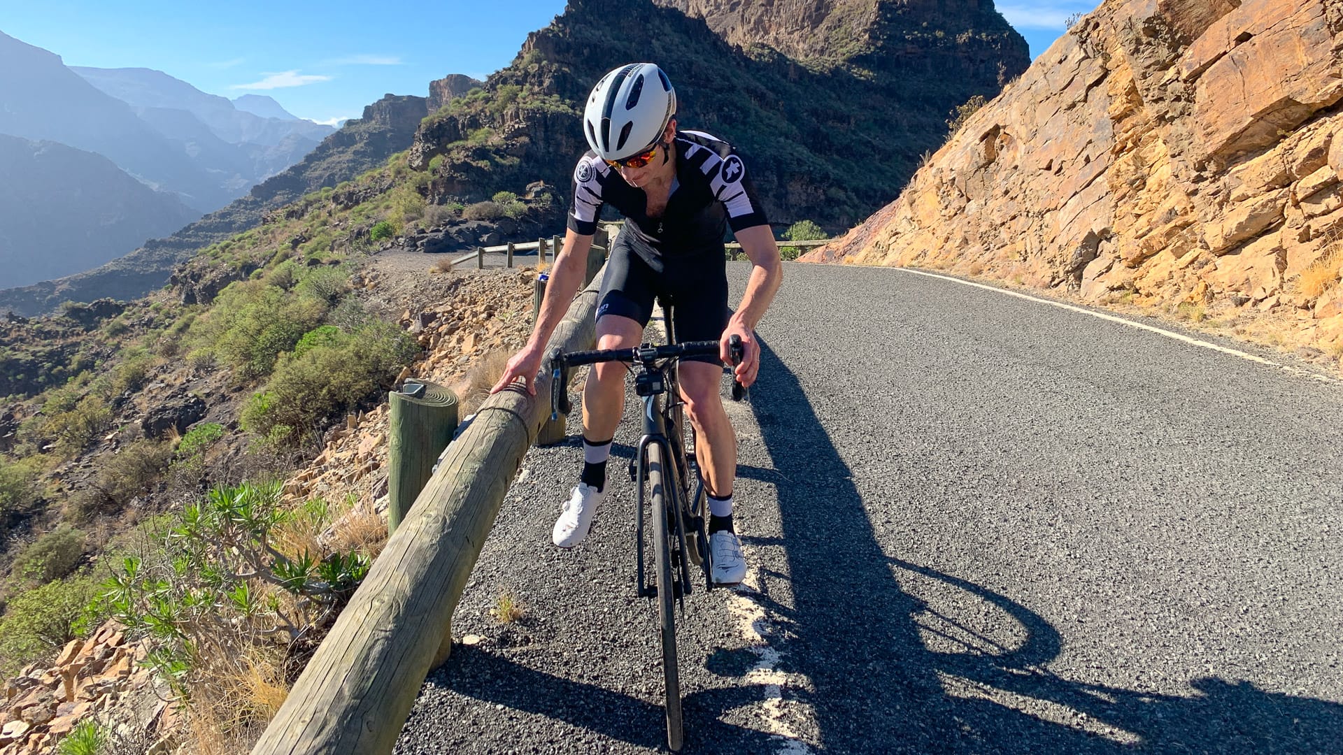 The GC605 down to Mogán is a glorious descent. When we rode it, the road surface on the first third was mixed with sections of old and new tarmac – but get off that and you’re flying. Heavenly twists and turns, the dappled light of the pine forest and reservoirs to your right and left. Then down further, majestic views down the valley towards the sea and fantastic, endless switchbacks sections that drop you down magically all the way to the junction with the GC200.