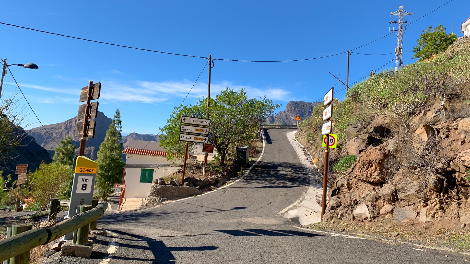 About 4 kilometres after the turn off is the hamlet of Carrizal de Tejeda, which clings to the side of the mountain and marks another steep section of climbing with gradients at 20%+ around the hairpins. The scenery here is much greener than earlier in the VOTT.