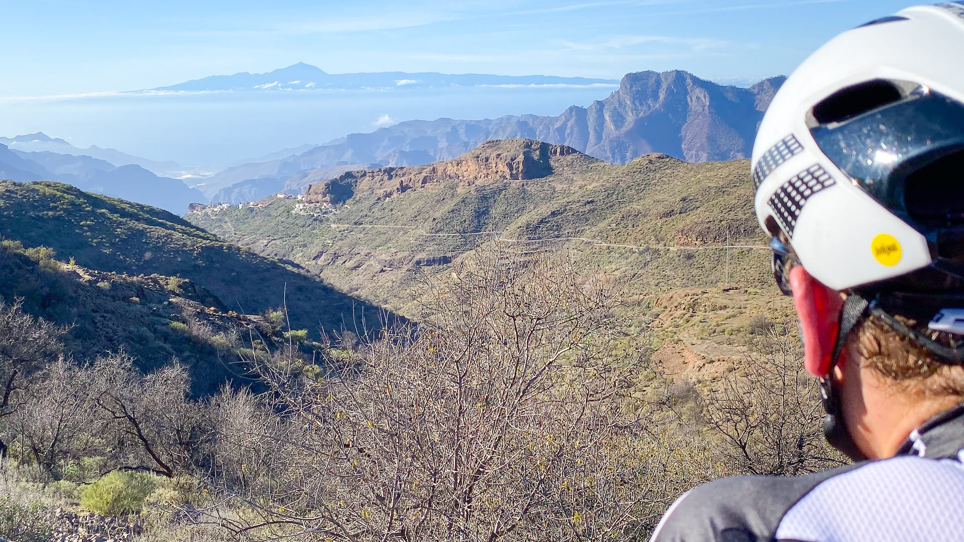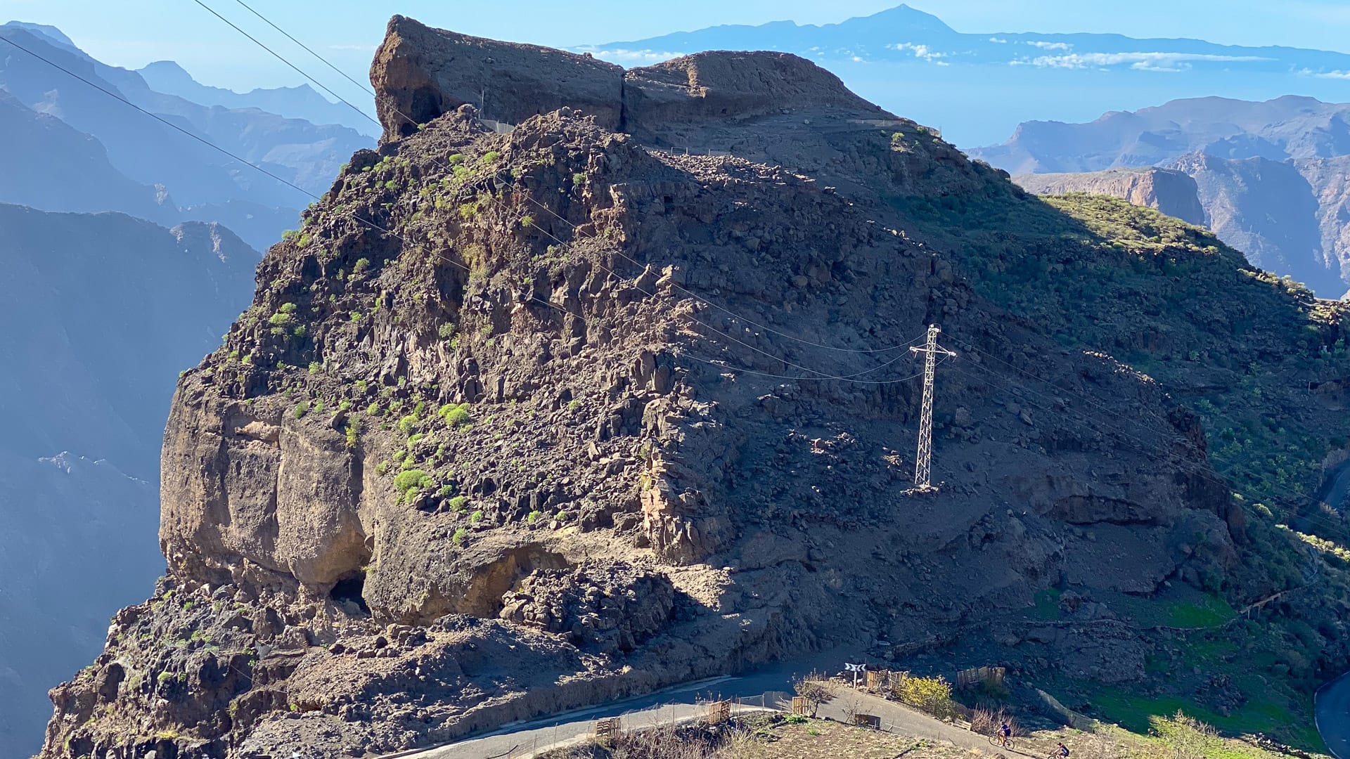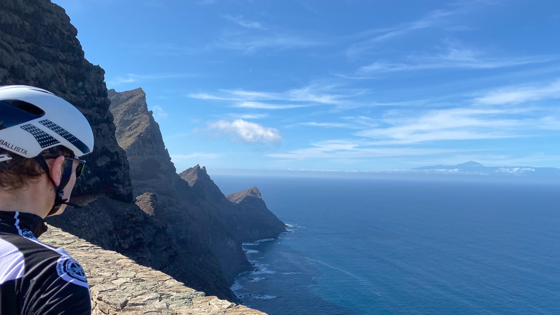 It’s not a particularly beautiful climb visually speaking, but at the top, the view out to Mount Teide on Tenerife, and along the vertical volcanic cliffs, is worth seeing.