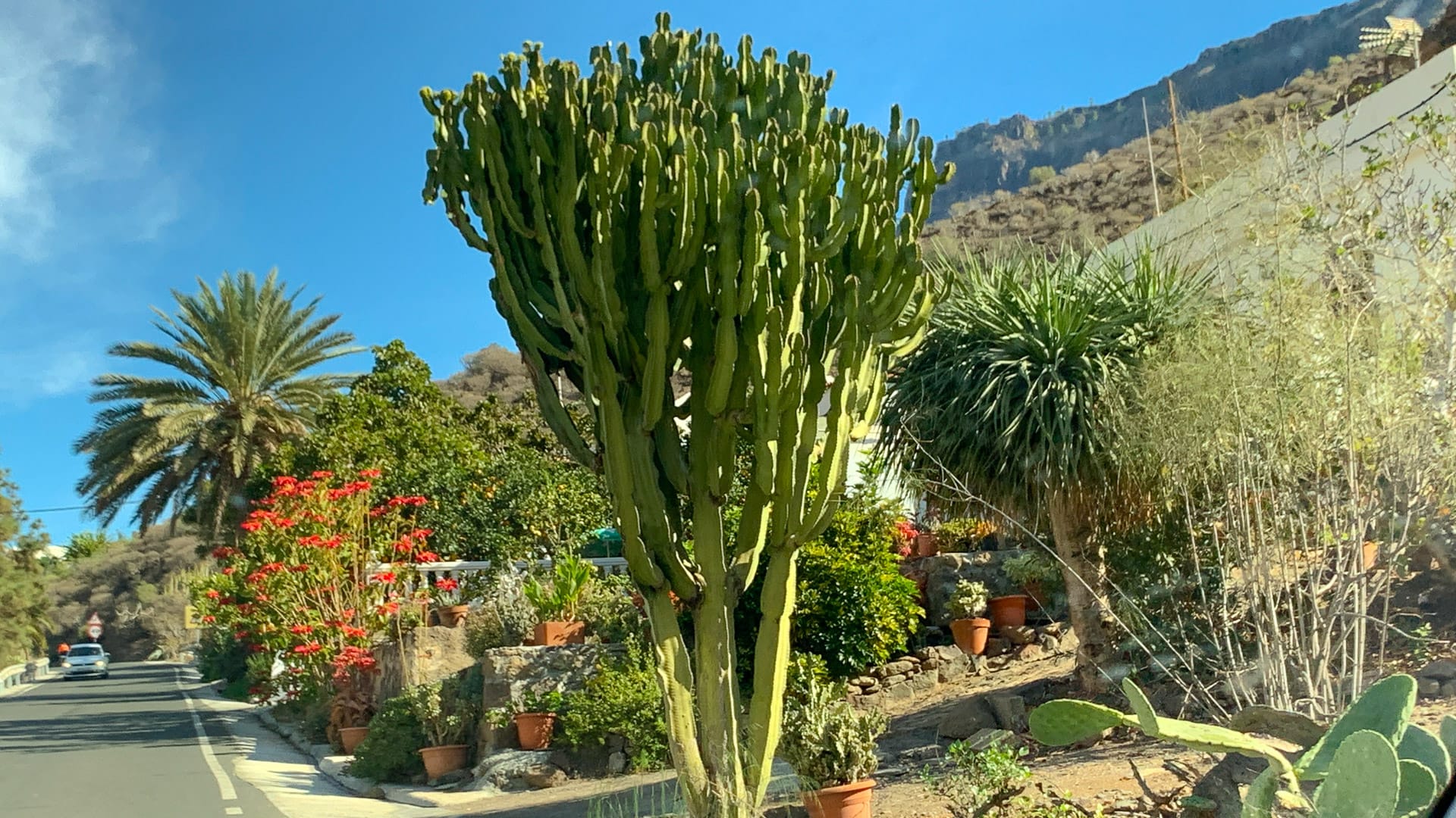 You climb away from the built-up coastline, on a good road, climbing gradually past the odd house and café, hamlets, cactus bushes and brightly coloured flowers.