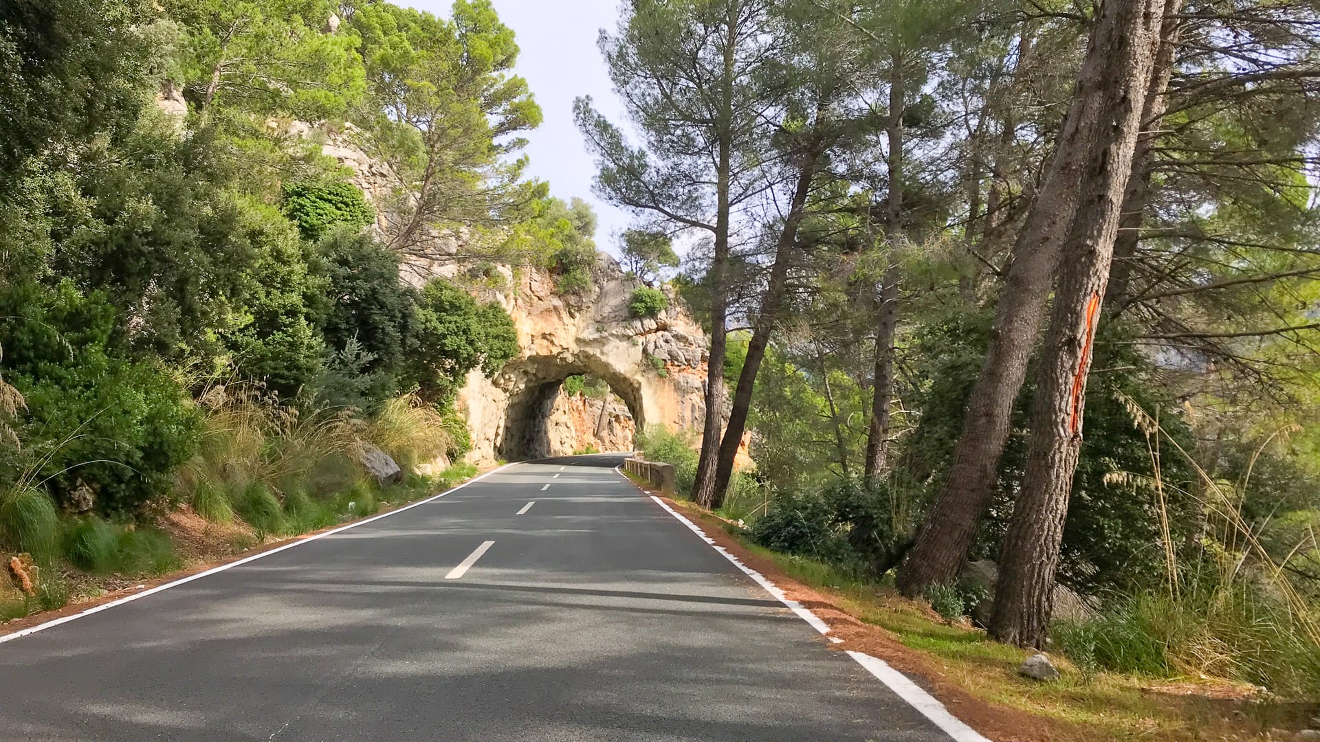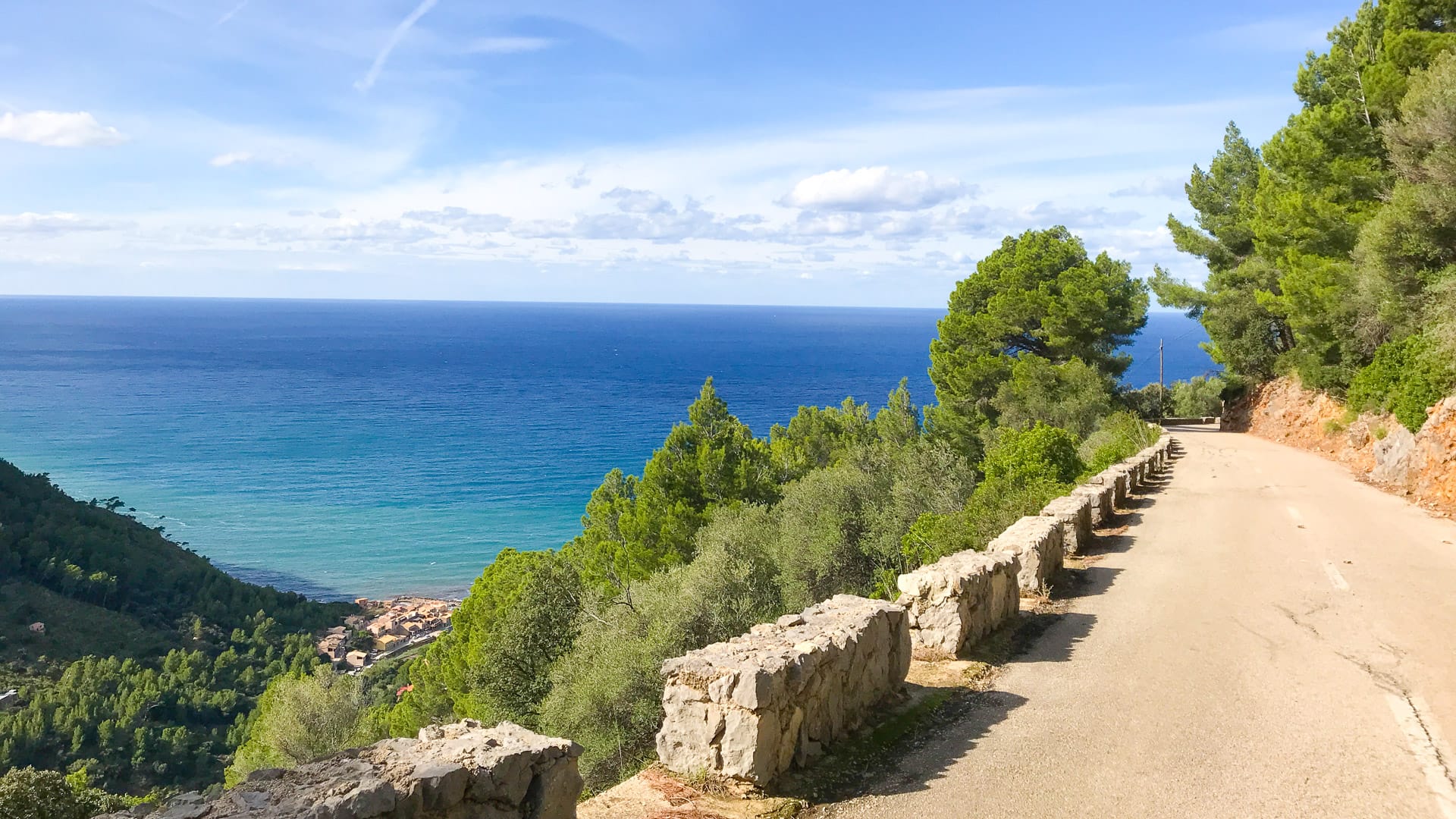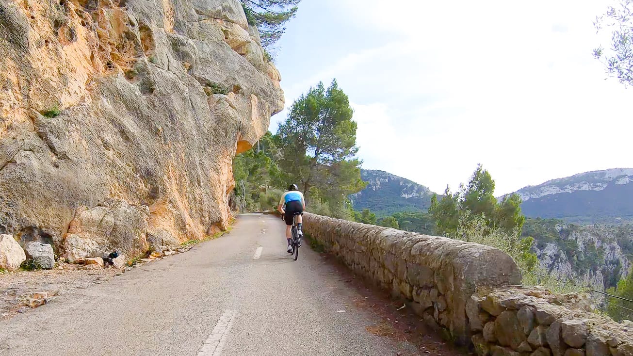 From Banyalbufar the road turns inland a little, so you lose the sea for a time but are still riding through attractive forest and craggy cliffs. At 40km comes the decision whether to turn down to Port des Canonge. There’s a full guide to that diversion here.