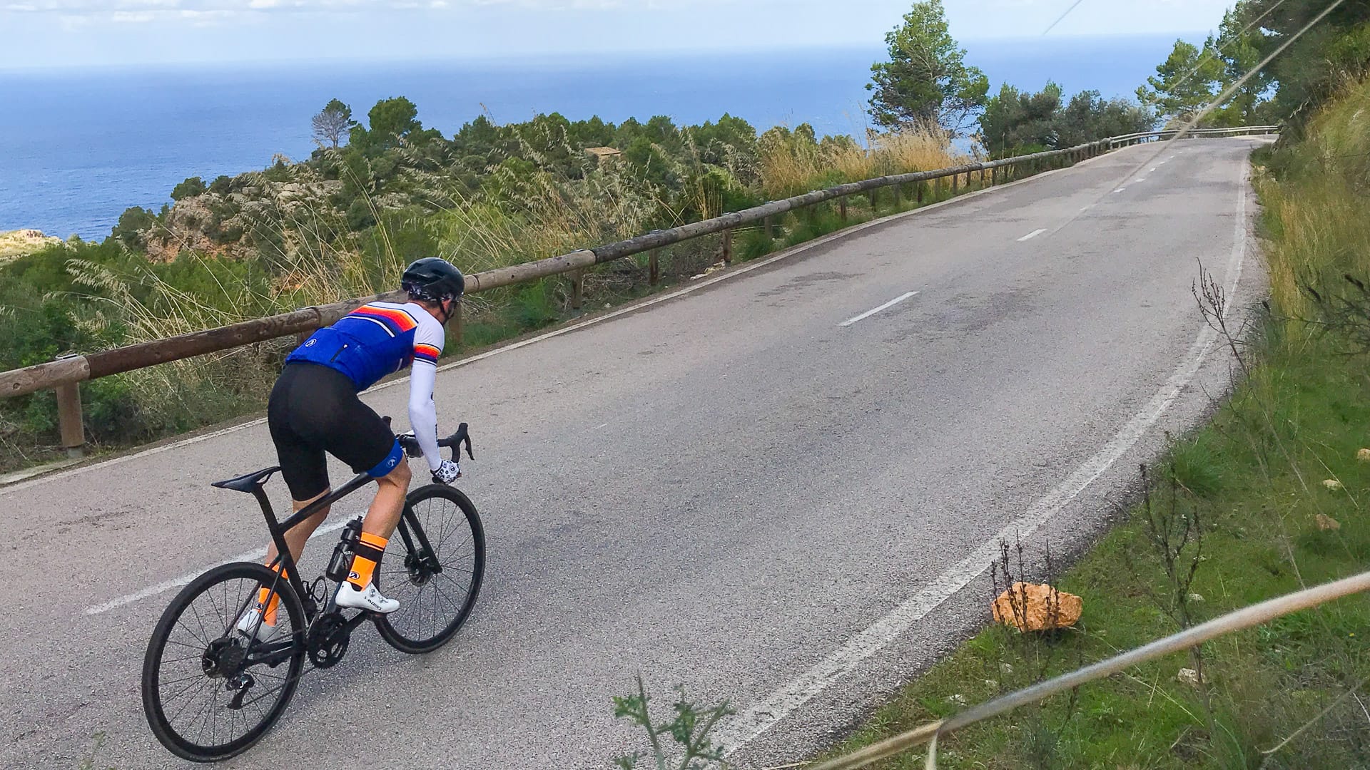 You reach the top of the Col de Femenia and it’s a cheek-rippling descent down. Sweeping corners allow you to get up speed – just watch out for the goats! If you do lift your eyes at any point, the views are spectacular with the coastal towns of Pollenca, Alcudia and their ports are visible.