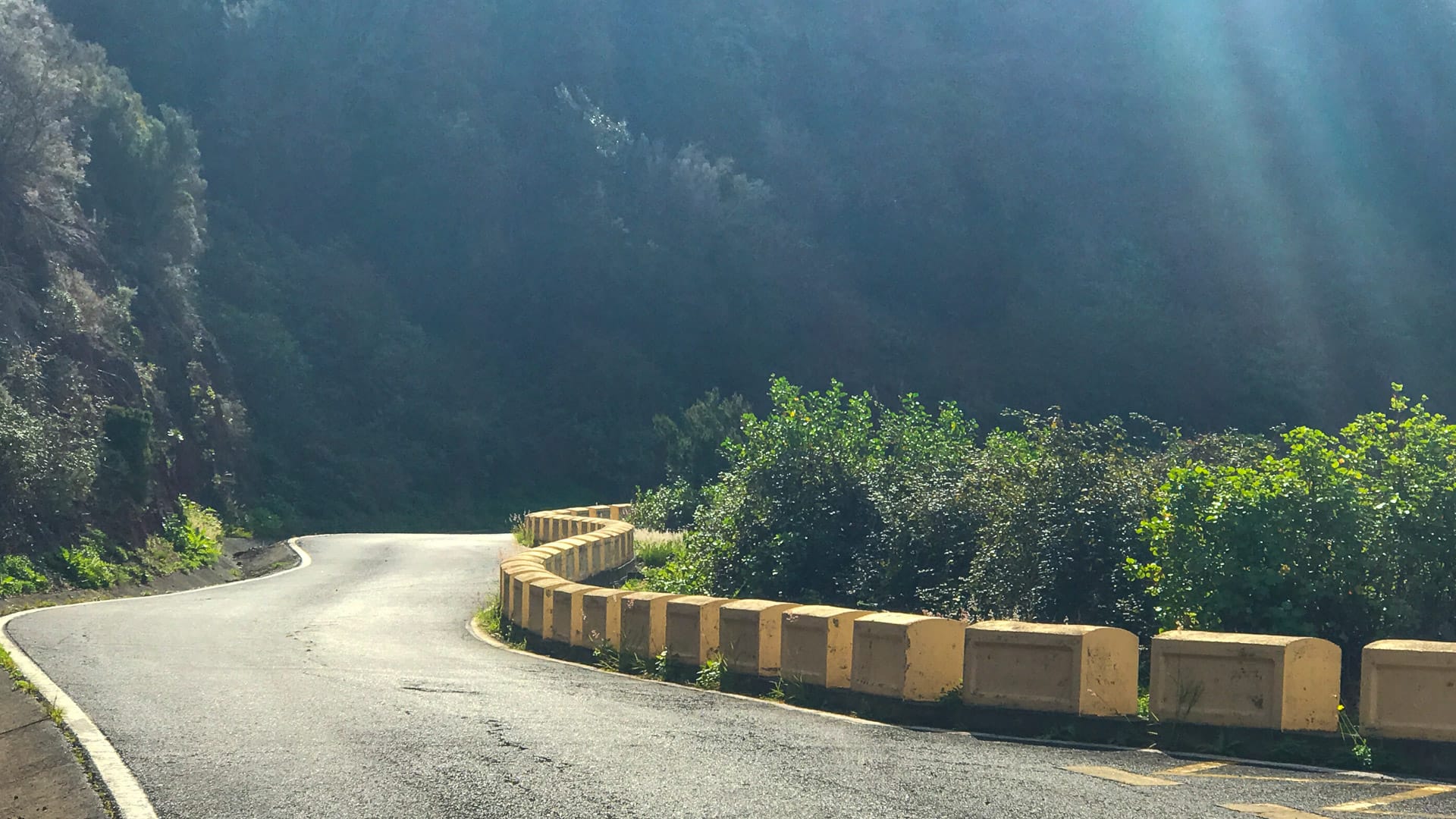 The TF-12: If you stay on the TF-12 and don’t head down from the ridge, it’s roughly 10.5km until the descent begins. It’s a bit lumpy, but tame by Tenerife standards, with an average 4.3% gradient, 600 m of climbing and 300 m of descent over those 10.5km. It’s a gorgeous ride, through shaded woodland, often cutting through cliff faces and interspersed with views over the richly carpeted slopes of the Anaga mountain range.