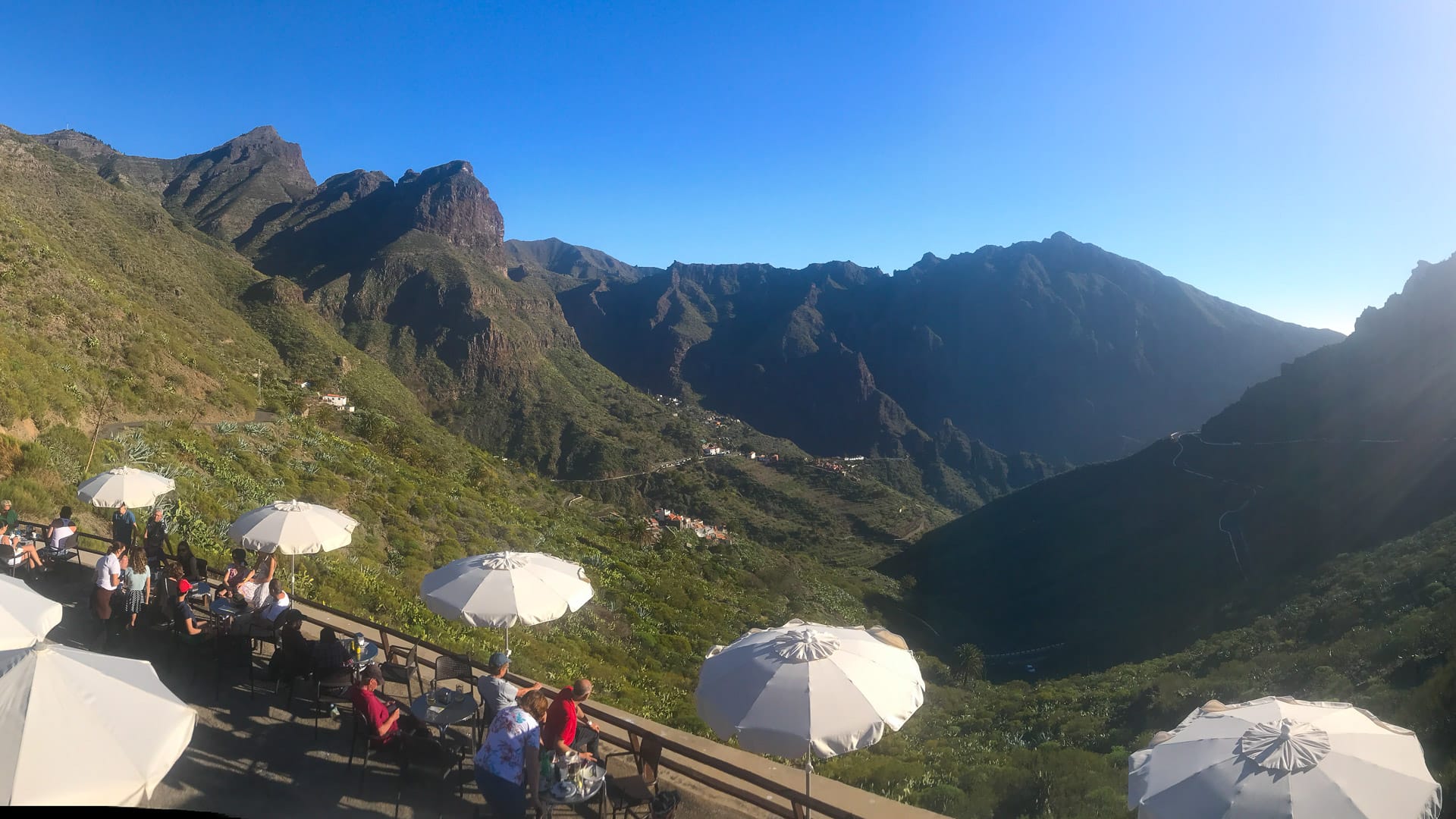 Riding the road from Mirador de Cherfe pass down to to Masca is one of the most dramatic descents we’ve ever done. Lift your eyes from the road for a second and you’ll see it snaking away, heading ever downwards, flanked by precipitous cliffs. Turn a few more bends and come to “that view” of the village, running along a ridge at the base of a bullet shaped rock, a mini Machu-Piccu. Sharply-cut ravine walls rise on either side and La Gomera island is framed in the V of the ravine sitting above a sparkling ocean.