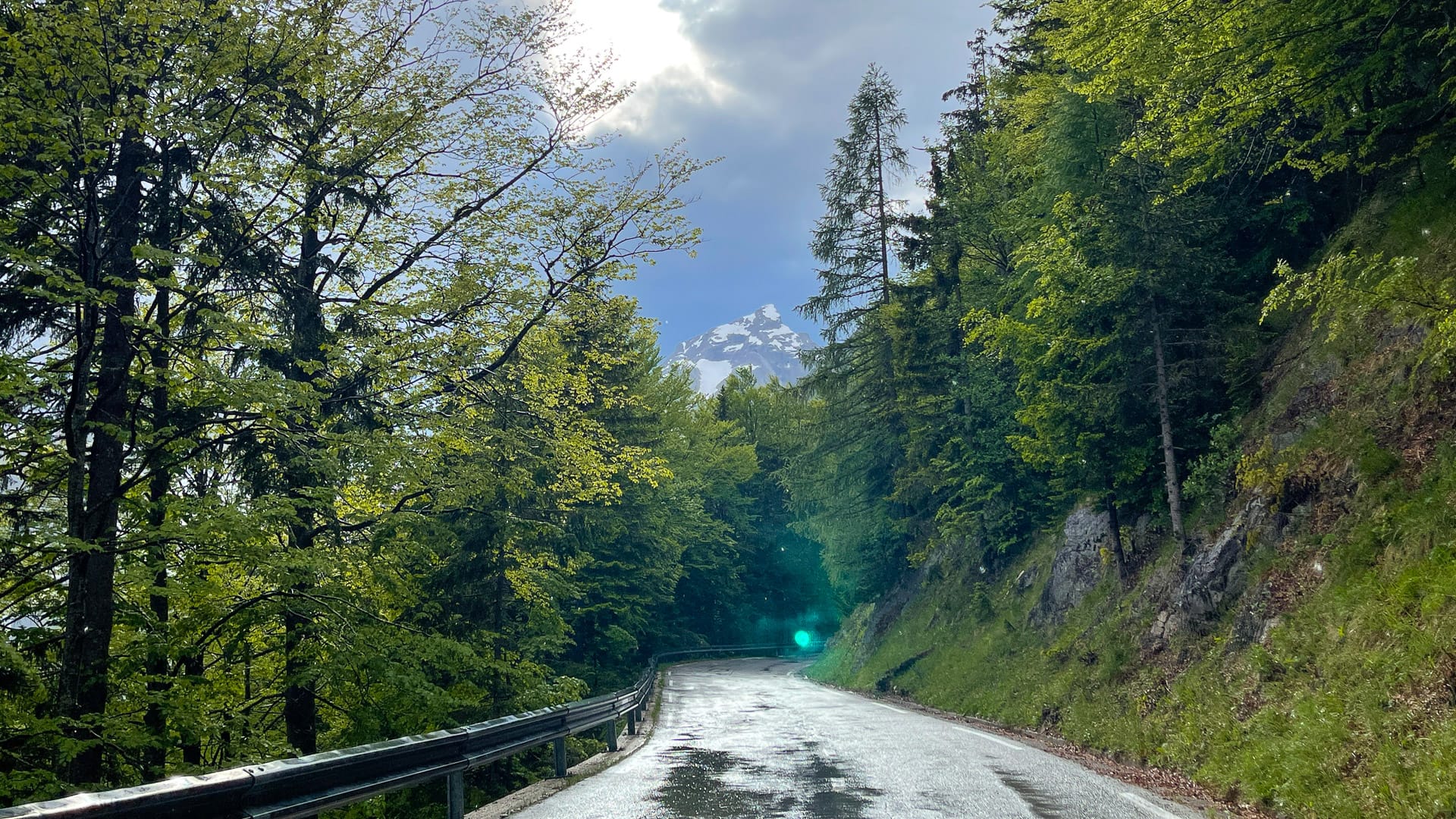 Quickly the climbing resumes with three kilometres through the Alpine ski mecca of Pokljuka, Slovenia’s foremost cross-country skiing resort which annually hosts the Biathlon World Cup. Leave the 905 and follow the road right to Rudno polje and you find yourself on a dead straight, flat road that dissects thick pine forests. If it looks familiar, it is frequently used for drone shots for car adverts!